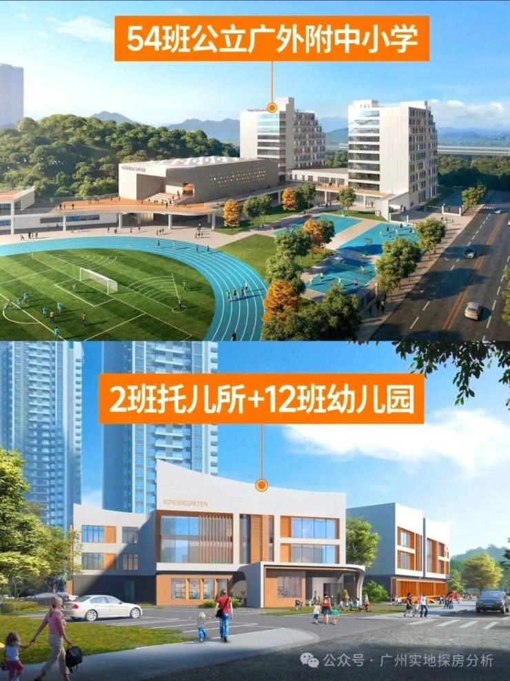 自建学校:项目配建2班托儿所、12班幼儿园及54班九年一贯制广外附属南沙学校(含36班小学、18班初中),2025年9月已开学,对口招生范围明确包含滨海花城小区。