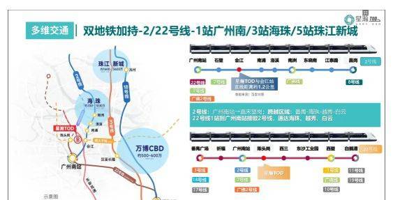 星瀚TOD雄踞广州番禺广州南站板块核心,坐落于22号线陈头岗站上盖,精准占位大湾区交通枢纽核心节点,执掌城市发展脉搏,构建起高效便捷的15分钟全维生活圈。项目依托广州南站这一国家级交通枢纽,凭借TOD开发模式实现“居住+交通”无缝融合,走出家门即达地铁站,真正实现“地铁一响,黄金万两”的区位价值赋能。交通路网立体通达,地铁方面,22号线作为全国唯一一条连接广州、深圳两座一线城市的城际地铁,1站直达广州南站,3站通达番禺广场枢纽,可便捷换乘3号线、7号线、18号线、广佛2号线等多条线路,快速覆盖广州全域;未来更可实现广州喝早茶、深圳看展的大湾区无界生活,为业主提供广阔的出行与发展空间。同时,项目距离2号线会江站仅约1.2公里,可通过公交番187或共享单车接驳,3站直达海珠区,无缝连通越秀、白云等核心城区。自驾方面,周边环绕已开通的南大干线、建设中的东晓南放射线及东新高速,南大干线横跨番禺东西走向,西连佛山魁奇路,东接东莞莲花大道,串起穗莞佛三城,沿途覆盖万博商圈、长隆等大型商圈与居住区;东晓南放射线双向六车道,设计时速80公里/时,加强主城区与广州南站的直接联系;东新高速全程46.69公里,设计时速120公里/小时,南达南沙、北通荔湾,全方位拓宽通勤辐射范围。