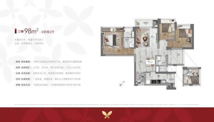 98平4房2卫,空间利用率不错。但卫生间的设置导致餐厅被挤压得很小。