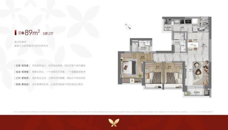 89平3房2卫,这是整个盘最热销的户型。每间房都方正,面积也均衡。小缺点是过道有点浪费空间。