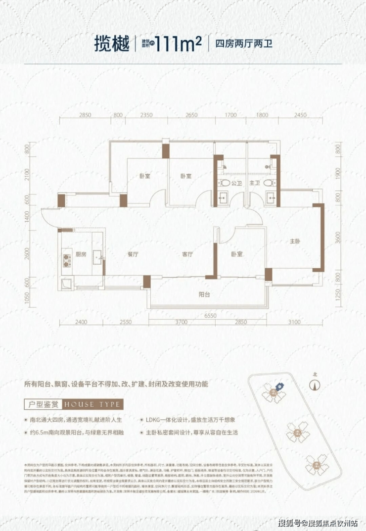111㎡的4房2厅2卫,设计的是横厅南北通透格局,独门独户,进门入户玄关,客餐厅6.25米开间,LDKB一体化,全屋10面飘窗,主卧南北通,分别做到了主卧16.6㎡/次卧10.54㎡/次卧9.27㎡/次卧7.41㎡(包含墙体飘窗),U型厨房,卫生间干湿分离,得房率约102%(包含赠送),客厅连接次卧出6.55米长的大阳台,约10.8㎡主朝东南向。