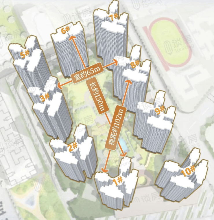 楼间距:项目采用围合式对称布局,通过旋转角度、错位布局拉大视距,南北楼距最长接近150米,东西楼栋视距最长达100米以上。