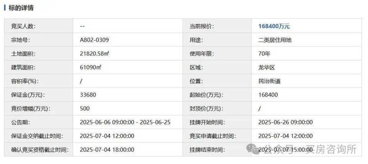 该地块土地用途为二类居住用地,土地面积21820.58㎡,建筑面积61090㎡,土地使用年限70年,按照“价高者得”的原则确定竞得人。