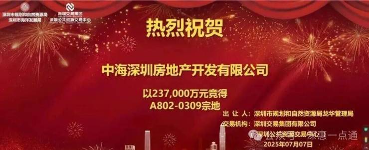 该地块是在今年的7月土拍而来,龙华A802-0309宗地土拍,6家房企历经53分钟108轮激烈角逐,最终由中海深圳房地产开发有限公司以23.7亿元斩获梅林关宅地!
