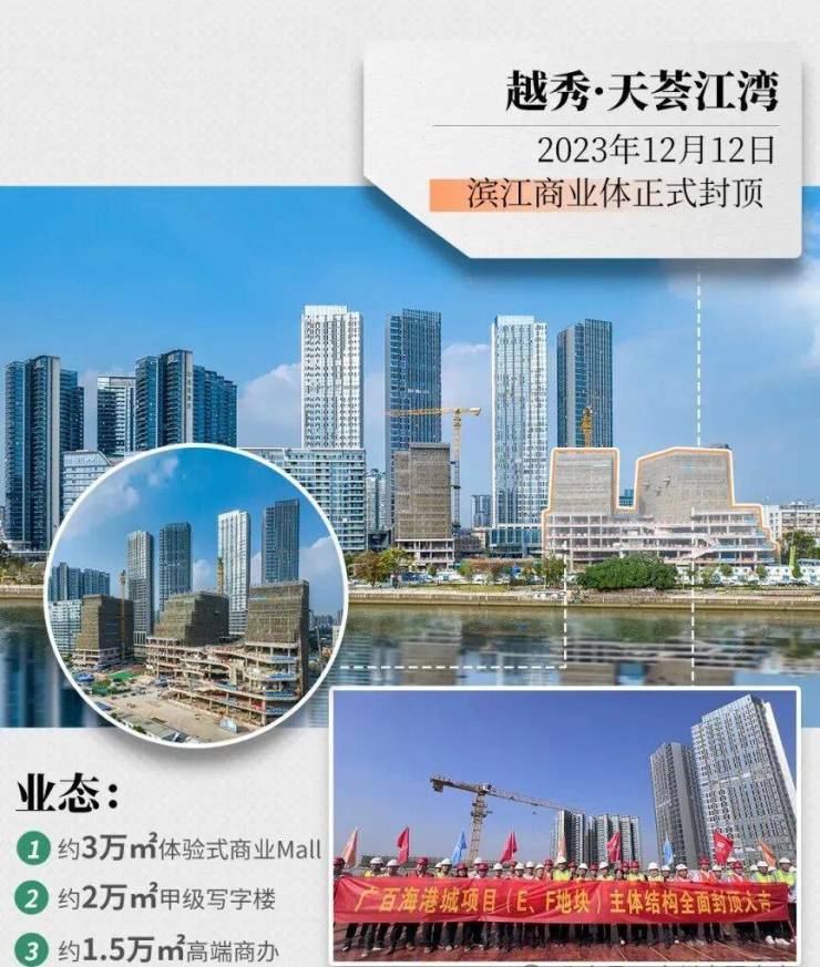 旁边的广百海港城已在2023年12月12日正式封顶,预计在今年底正式开业,它是广州首个大型的滨江海港城,集商务办公、休闲购物、酒店于一体,计划引进奢侈品牌旗舰店、生态写字楼、五星级酒店等业态。家门口解决吃喝玩乐,给项目加分不少。