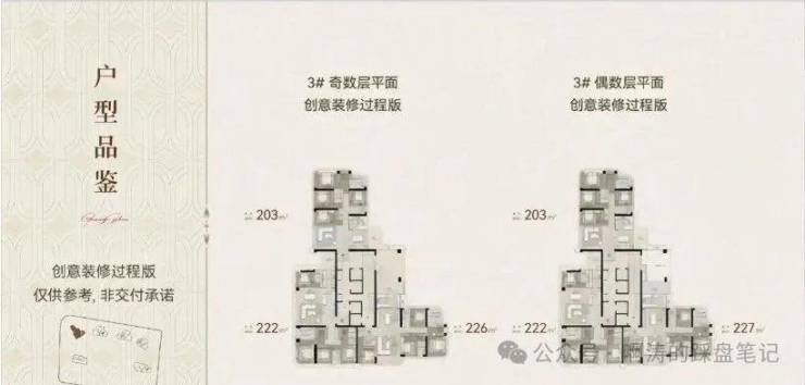 226/227㎡户型特点: 4T3户,均有独立电梯及门厅互不扰; ·8*8.4m大方厅,宽敞大气; ·超款客厅落地景观面,客厅、阳台、众数套房可望 江望琶洲总部及广州塔,景观优势(无主阳台); ·有独立工人房但无赠送平台; ·主卧270°景观转角飘窗,800mm飘窗可打;