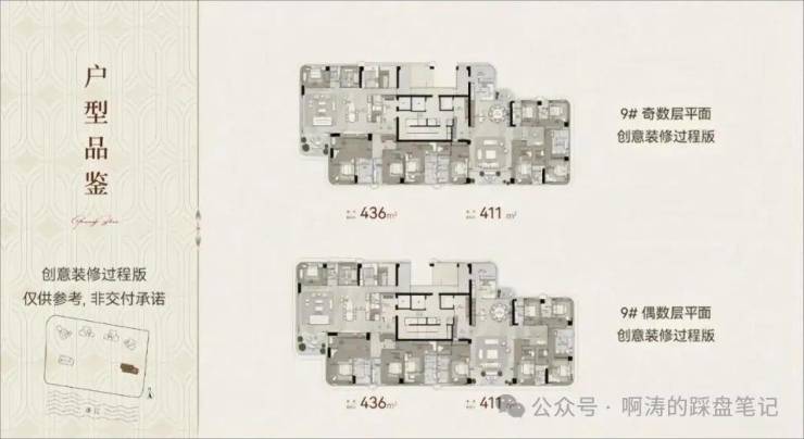 411㎡户型特点: 一层两户,3T2户独立梯厅互不扰; ·8*15m客餐厅,宽敞大气; ·动静分区,南北对流; ·10.7㎡全赠送共享平台6.6m层高可 复式搭建; ·工人梯独立动线,保障豪宅私密性; ·主卧270°景观转角飘窗