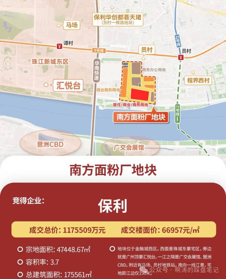 2024年9月29日,广州土地交易市场迎来载入史册的重要时刻。天河区临江大道北侧AT080722地块(原南方面粉厂地块)历经五大开发商长达5小时、148轮激烈角逐,最终由保利集团以约117.55亿元收入囊中,成功刷新天河区土地成交记录。