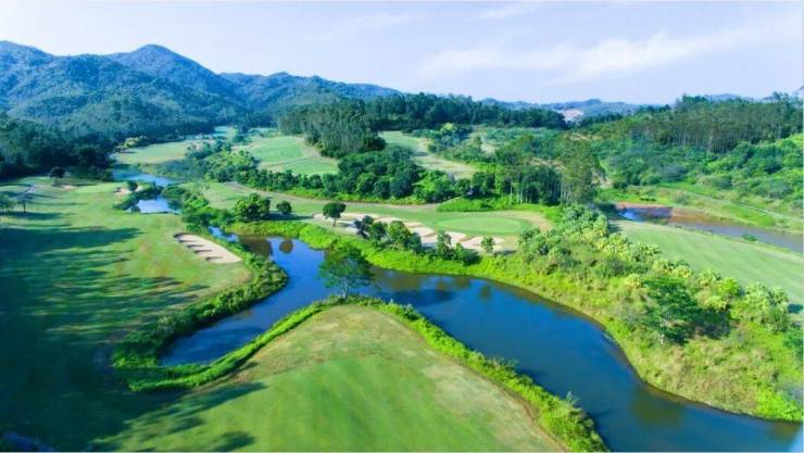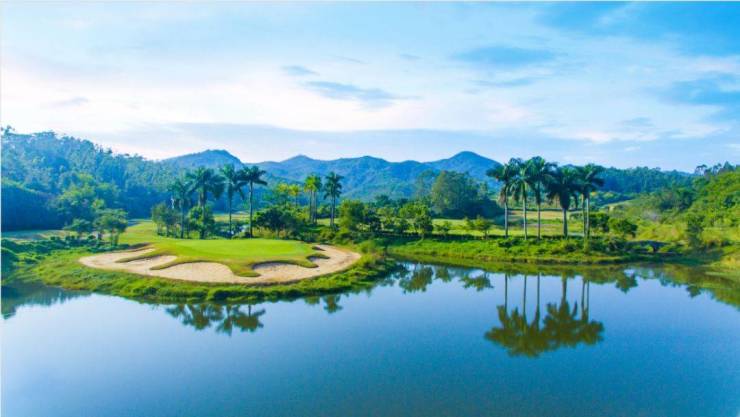 远处的山层层叠叠地铺盖着约928亩葱茏果岭,树影斑驳,高低起伏的果岭和视野连成一线,仿佛站在绿海之上,感慨一片波澜壮阔。