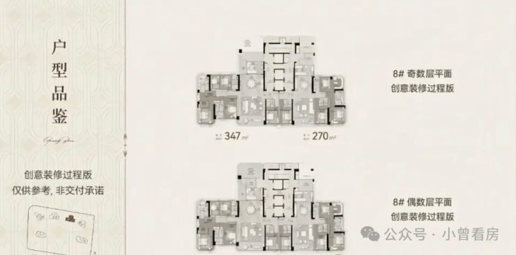 6号楼和8号楼均为49层高,在售270-273㎡、346-347㎡户型,3T2户独立梯厅,5.711.65m或7.911.7m直厅,南北对流双阳台,奇数层270-273㎡户型带有32㎡6.6m通高平台空间。