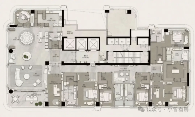9号楼37层高,在售411㎡、436㎡5+1房户型,3T2户设计,815m或1012.5m大空间客餐厅,动静分区明确,带10.7㎡全赠送共享平台。