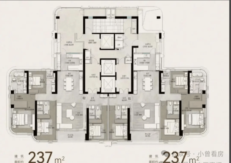 226-227㎡为4房4卫,88.4m大方厅搭配超宽落地景观面,多数房间可望江。