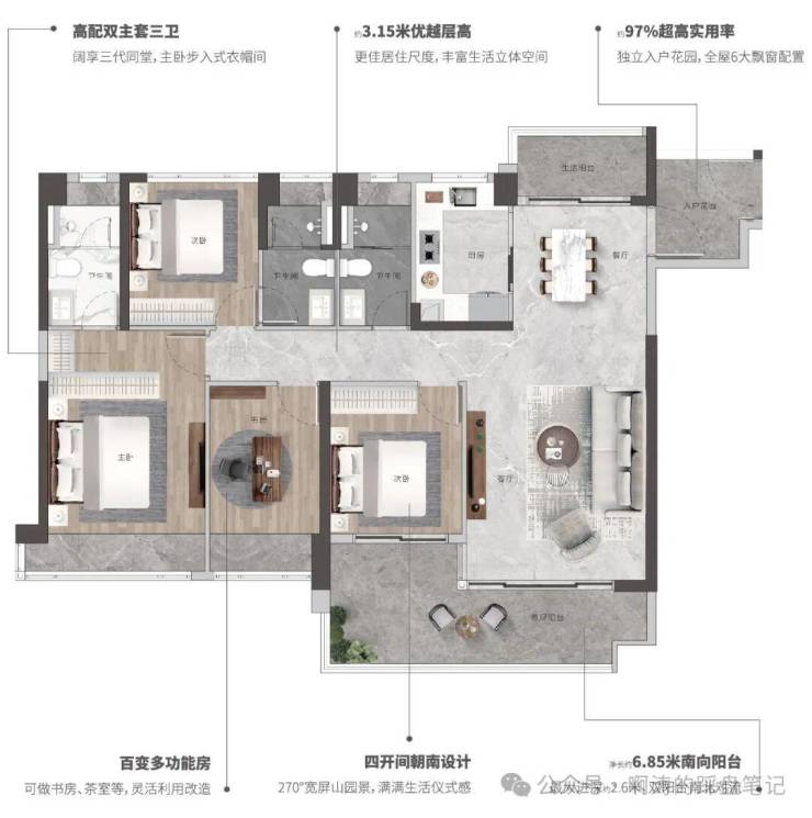 立面简约大气、空间舒适、实用率高,配合大面积玻璃、IMAX级景观阳台、全景超宽飘窗、约3.3米墅级层高等打造第五代品质住宅,引领广州审美前沿。