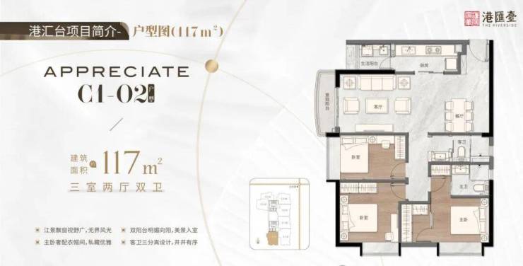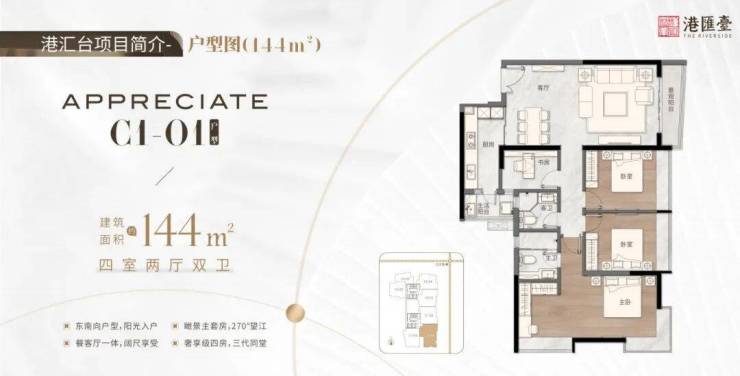 :东南向 270° 环幕江景,餐客厅一体 + 瞰景主卧套间,三代同堂也不显拥挤;