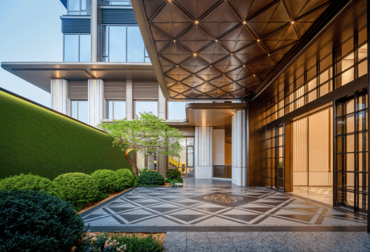 宝格丽酒店式大堂、采用下沉式设计,金色格栅与水刀拼花的典雅地面,营造奢雅质感,仿佛置身上海宝格丽酒店的私享秘境。