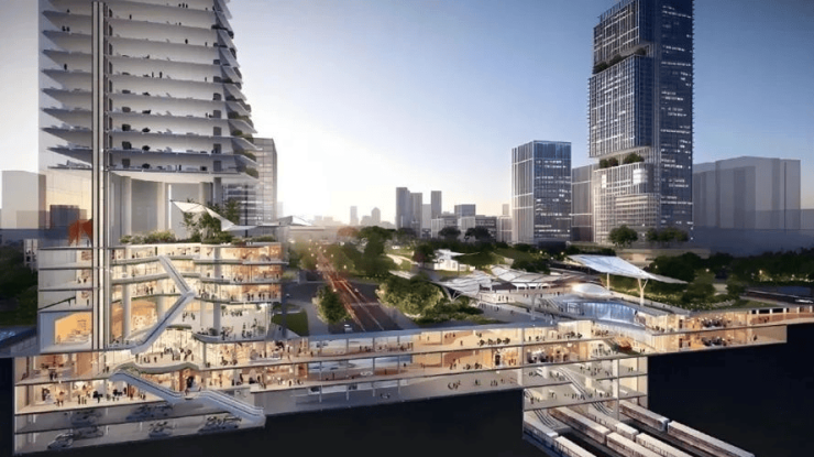 番禺广场融合TOD复合型城市发展模式,打造“地下商业+地上公园”,规划钻石喷泉广场、螺旋艺术展廊、宝石商业广场及翡翠绿阶等公园景观,以自然之链串连形成“大珠小珠落玉盘”美妙意境。