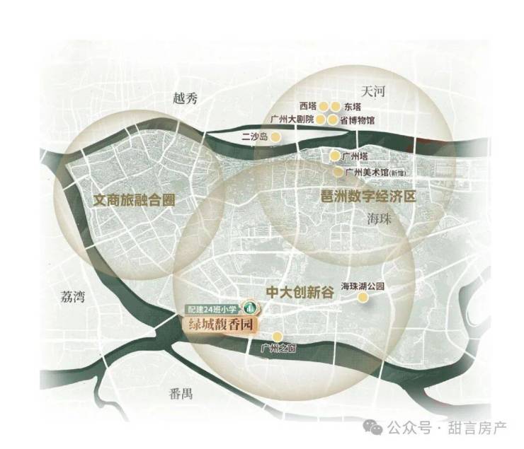 “琶洲数字经济区、文商旅融合圈、中大创新谷”三大产业板块环伺
