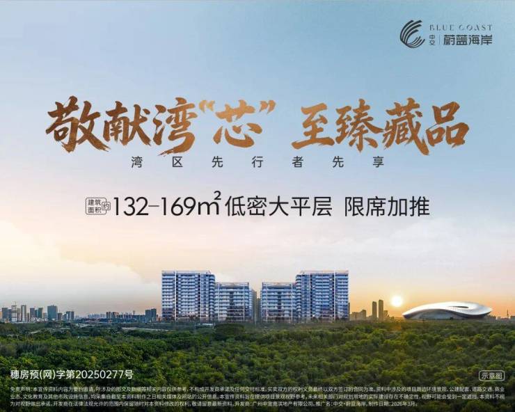 中交蔚蓝海岸是广州南沙万顷沙低密纯改善、四代海景板楼、深中通道首站的标杆新盘,以超低容积率、高赠送、纯大户型、湾区枢纽为核心优势,同时受地段偏远、配套空白、通勤成本高、片区待开发制约,主打深圳外溢 + 长线投资 + 滨海度假,非市区刚需首选。