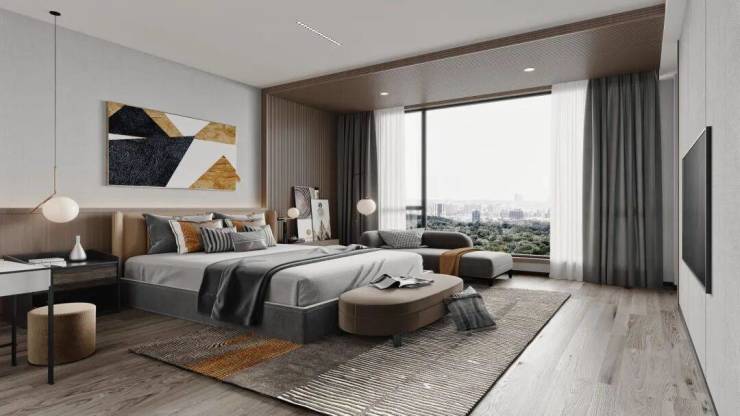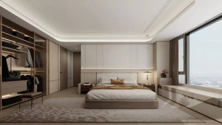 宽境主卧套房尺度奢阔,宛若空中行宫,将主人的身份与品味展现得淋漓尽致。
