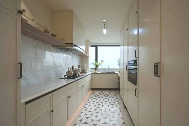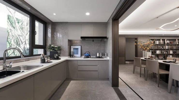 户内空间布局极具巧思,厨房与生活阳台巧妙结合,可开可合,能根据家庭不同阶段的需求,在开放式美食空间与独立中式厨房之间自由切换,赋予生活更多弹性。