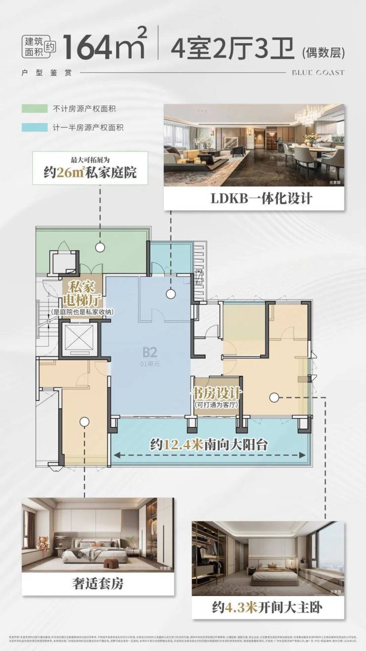 项目主打纯板楼小高层,档次肯定不会低。大阳台搭配大开间,还是两梯两户设计,要是放在广州核心区,就是千万级豪宅的配置了。再加上有海景、水景,以及体育馆这种城市地标加持,上限的确会比一般的改善盘要高。户型也随之曝光,户户空中庭院,最高使用率达到约130%,这也是广州的第三个四代宅项目。