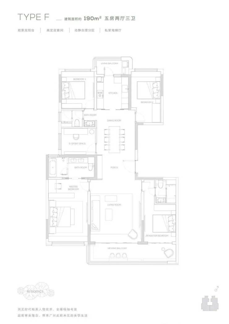 190产品为五房两厅三卫产品,充满了对云端人群生活的独特见解,南向双主卧,中西厨布局,打造纵向超长LDK一体化空间,产品所体现的不只是居住产品,更是特属客群所拥有的生活方式。