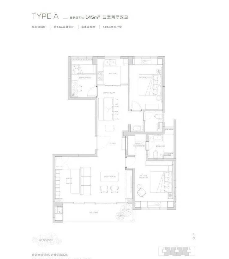 145产品为三房两厅两卫产品,餐厨一体化设计, 7米宽厅可切换各种生活场景,畅享宽幕般景观界面。