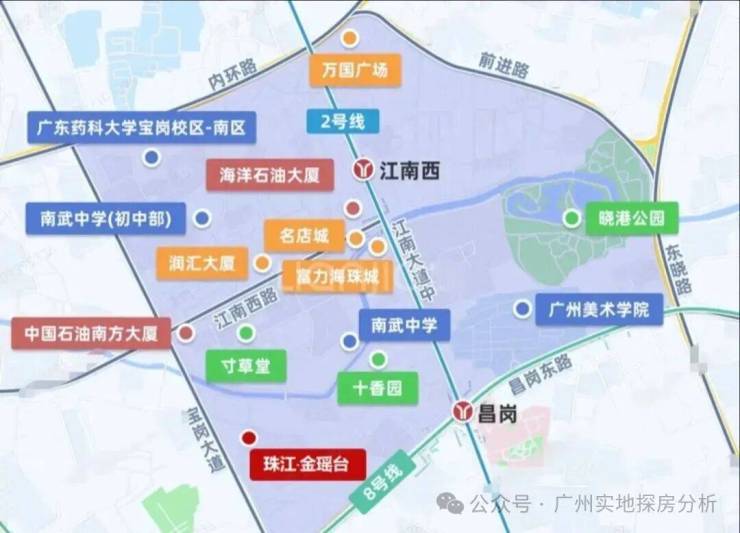 项目对面有昌岗中路小学和海珠江南外国语学校周边还有广州市南武中学、广州市第五中学广州市海珠外国语实验中学等学府。