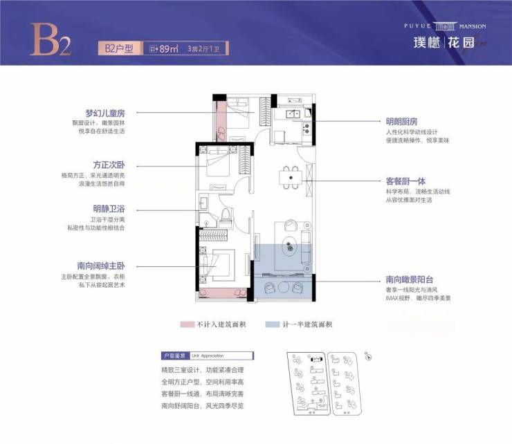 2. 餐客厅一体化,宽景人居尺度;观景双阳台,南北通透清风伴。
