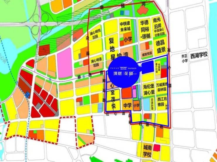 (蓝框为小学学区范围、红框为中学学区范围)
