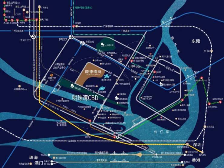 颐德湾尚坐拥五维立体交通网络,地铁、高速、高铁、海港、机场一应俱全;项目周边有4/15号线(规划中)双地铁环绕,18/22号线(首段均已开通)快速接驳广州中心城区;深中通道预计2024年通车后将进一步拉近与深圳的距离;区域交通将形成“15、30、60交通圈”:15分钟车程到庆盛站高铁枢纽;30分钟直达香港西九龙;30分钟抵深圳;60分钟到达中山、珠海、澳门等大湾区核心城市;此外,经广深港高铁可直达广深港核心CBD,南沙客运港直达深圳机场码头及香港中港城,国际邮轮母港则可通往日本及东南亚国家,出行极为便捷。