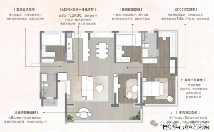 建面125㎡四房两厅两卫,约8.4m双开间超跑奢阔阳台,约5.5m超大客厅开间。