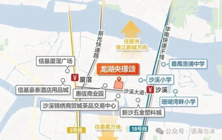 距离18号线沙溪地铁站约600-700米,18号线1站万博,2站琶洲,3站珠江新城。