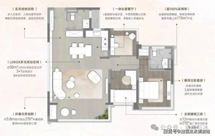 建面95㎡三房两厅两卫,近12m南向大面宽尺度,双270°超广角采光卧室。