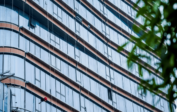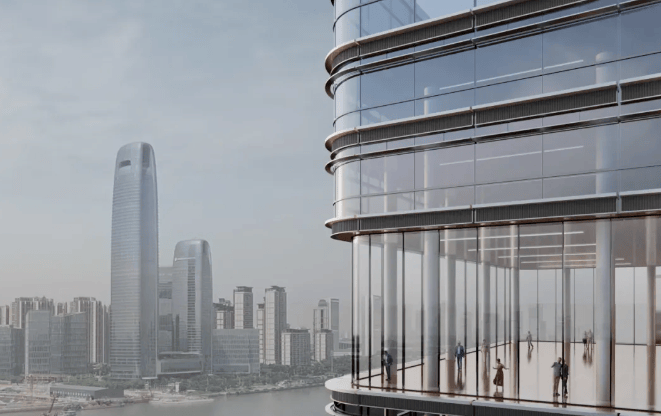 外立面采用木色陶板与全景玻璃幕墙,以“曲水流觞”的涟漪造型呼应珠江文脉,同时融入垂直生态理念,打造空中绿岛与可呼吸的建筑肌理。