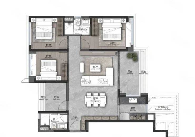 目前在售的户型覆盖刚需到改善需求,得房率超过 100%,每户还配备 5-8㎡的设备平台,相当于额外多出一间房。