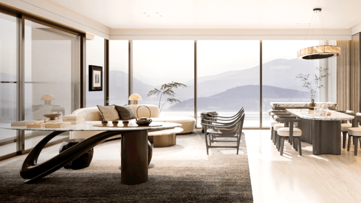 室内约3.5米的层高,不仅带来了开阔通透的空间感,也为个性化的艺术陈设与智能系统集成提供了更多可能。270°转角环幕客厅结合全玻璃幕墙,创造了震撼的视野与采光。尤其值得一提的是创新的LDKT(客厅、餐厅、厨房、茶厅)一体化设计,打破了以电视墙为中心的传统布局,融入独立休闲茶台,使客厅成为融合社交、亲子、阅读、轻餐饮的复合型家庭核心交流场。