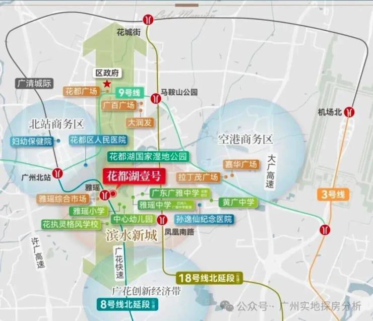 2、交通便利,项目位于广花路与空铁大道交汇处,紧邻在建的地铁8号线雅瑶站(预计2028年通车),未来可通过地铁3站直达白云区、15站通达越秀核心区,同时距广州北站直线3km,13km快速直达白云国际机场,交通网络发达。