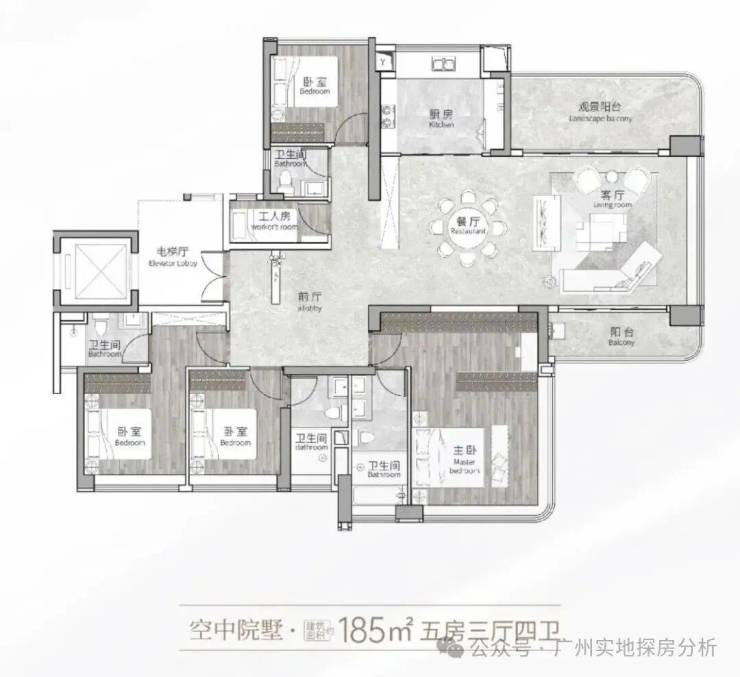 【揽境】建面约185㎡五房四卫,豪华三套房设计,南北双景观阳台,视野无敌。