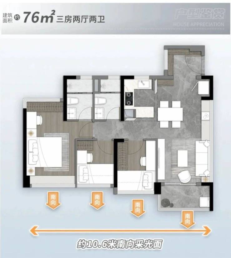 76㎡三空间两卫,年轻人主城上车首选 ,四开间朝南 全明转角玄关 开放式厨房,开阔景观阳台 南北对流主套&衣帽间。