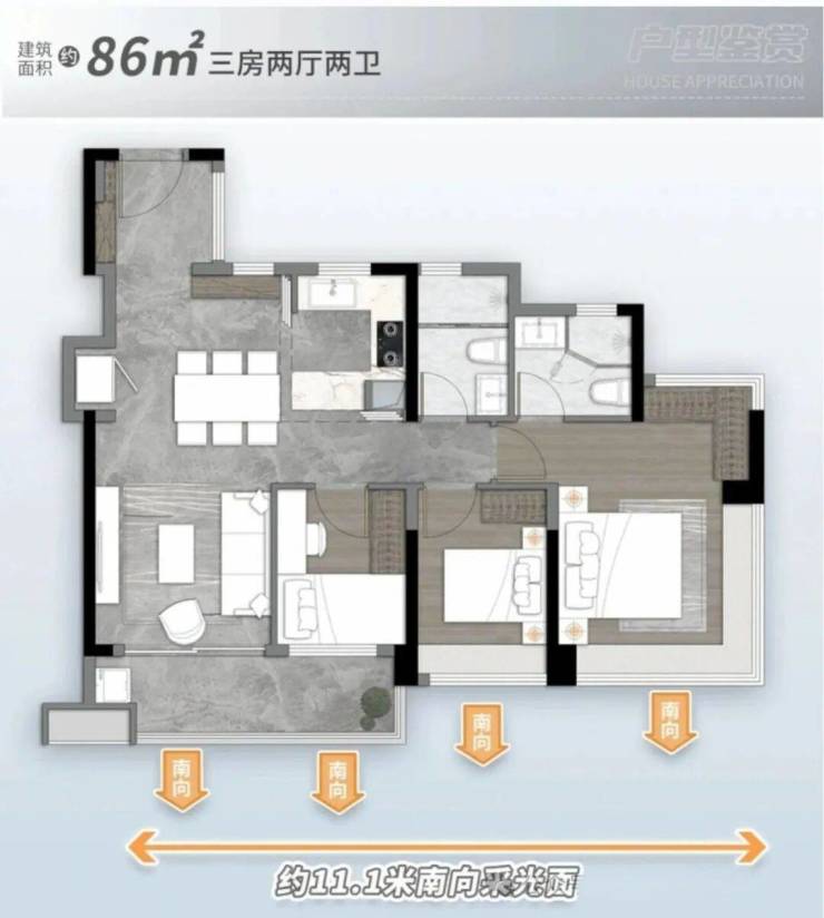 86㎡三空间两卫,三口之家一步到位,一期断货王PLUS 南向4开间 约11.1m采光,双进私密玄关 5.4m跑道式阳台,主卧270°无立柱景观飘窗 阳光衣帽间 。