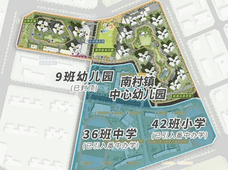 配建了一所42班小学和36班初中,总提供3600个学位,该项目已成功引进公办名校番禺中学进行办学,预计2025年9月就能开学。