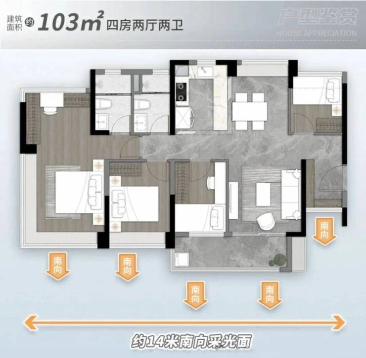 103㎡四空间两卫,三代同堂换房必看,阳光入户 五开间约14m采光 开放式厨房,270℃无立柱转角阳台 阳光梳妆台&衣帽间。