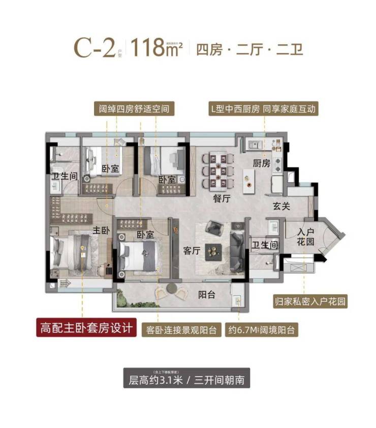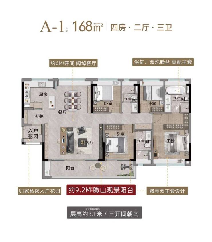 ·约3.1米层高,约6.1-9.4米宽景阳台,采光通风极佳