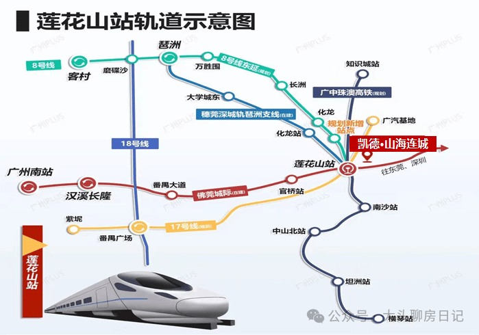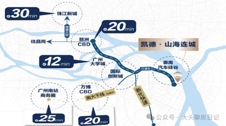 莲花湾板块,属于番禺东石楼镇,整体发展缓慢,配套不齐全,得益于南大干线的开通,缩短了到市区的距离,开车出行非常方便,比如到琶洲30分钟左右,还有规划地铁8号线东延段,但是也要3-4公里,跟17号线,还有两条城轨,一条高铁,打造所谓的五轨交汇的莲花湾TOD,不过都是需要时间兑现,哪怕建好都是不近现在在售的楼盘,也要2-3公里。