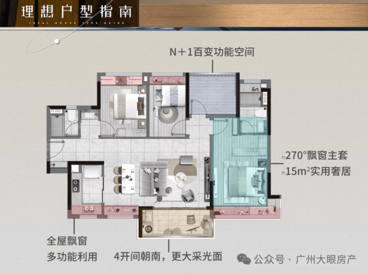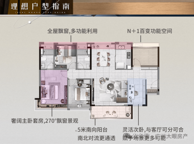 采用LDK布局,连通270°朗阔阳台,南北对流主卧套房,L型瞰景飘窗