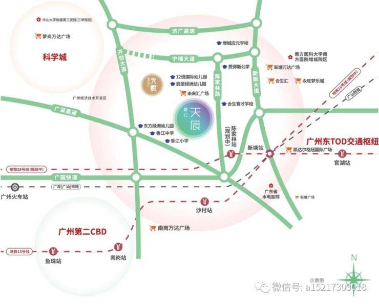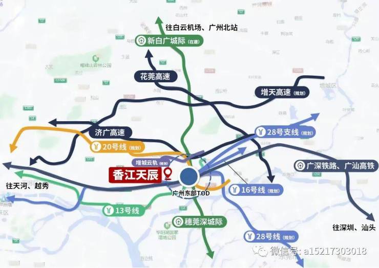 九轨交汇的交通枢纽,规划4地铁(13号线、16号线、23号线、28号线),3高铁(广深、京九、广汕高铁),2城轨(穗莞深、新白广城轨)。广州东TOD还规划约18平方公里中央商务区,“TOD+CBD”的珠联璧合,吸引信息技术、汽车及新能源汽车、金融科技等产业集群。项目位处广州东TOD辐射区,可长期坐享资源、人口红利。