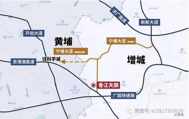 两纵三横:开创大道、宁埔大道(建设中),广深高速、广园快速、广深大道,路网密布,快速通达黄埔、科学城、天河等中芯区