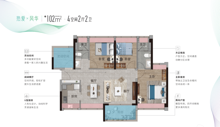 “南向蝶式住宅”结合南方人居特征,利用空间规划,最大程度拉开楼间距,通风、采光、景观皆是一流。