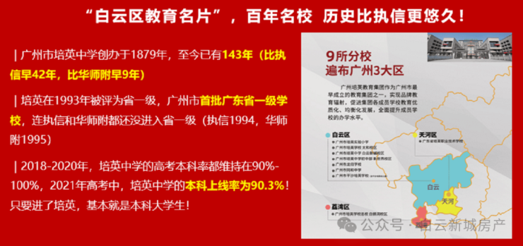 广州培英中学已有 145 年建校史,广州市首批广东省国家级示范性高中,近年来高考本科率超90%(不做入读承诺)。100m内有九年一贯制华赋学校,3km内有大源小学、金星小学等多所优质中小学。